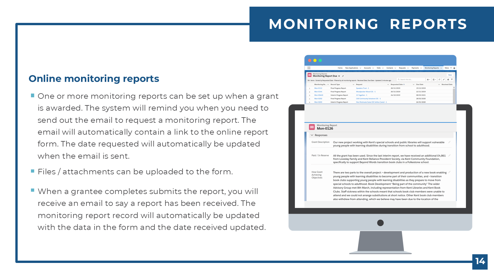 Have your grantees complete and submit their monitoring reports online.